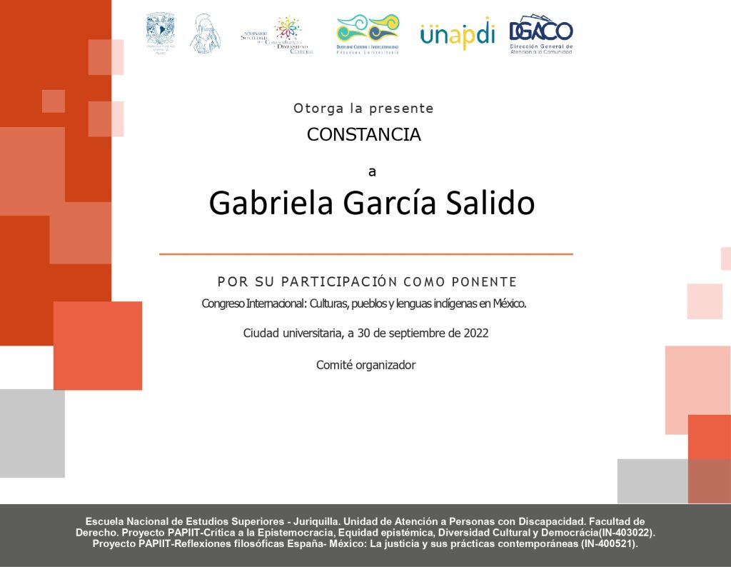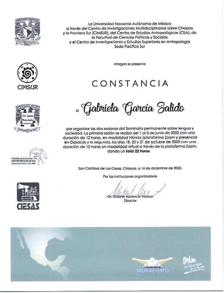 2022. Entrecruces de la deixis espacial y temporal en los sapook o’dam, en el Seminario Permanente sobre Lengua y Sociedad, 1, 2 y 3 de junio de 2022 en CIESAS Oaxaca Pacífico Sur. (por invitación).