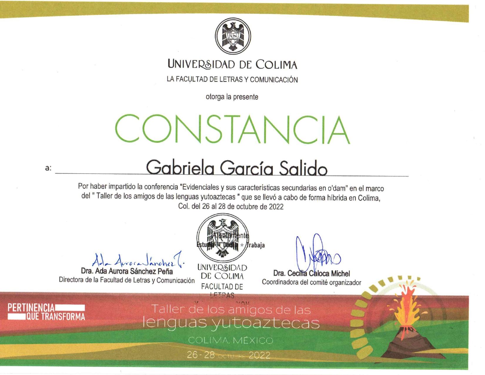 2022. Acciones internas y externas de documentación y preservación lingüística en el tepehuano del sur. Congreso: “Culturas, pueblos y lenguas indígenas en México. NADA SIN NOSOTRAS Y NOSOTROS”. 20-23 de septeimbre, UNAM. (co-autora Inocencia Arellano). (por invitación).