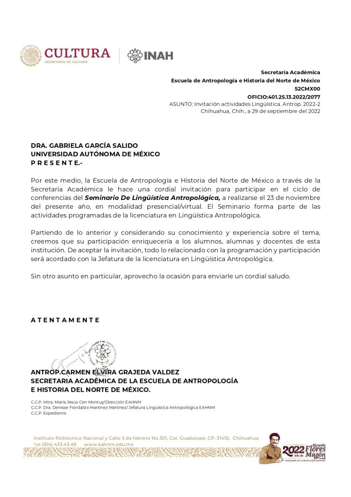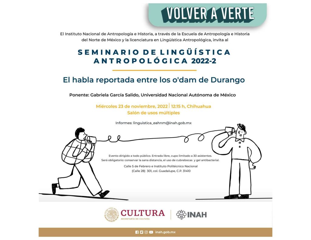 2022. El habla reportada entre los o’dam de Durango. Seminario de Lingüística Antropológica (SELIAN). Escuela de Antropología e Historia del Norte de México. Chihuahua, México. 23 de noviembre de 2022. (por invitación).
