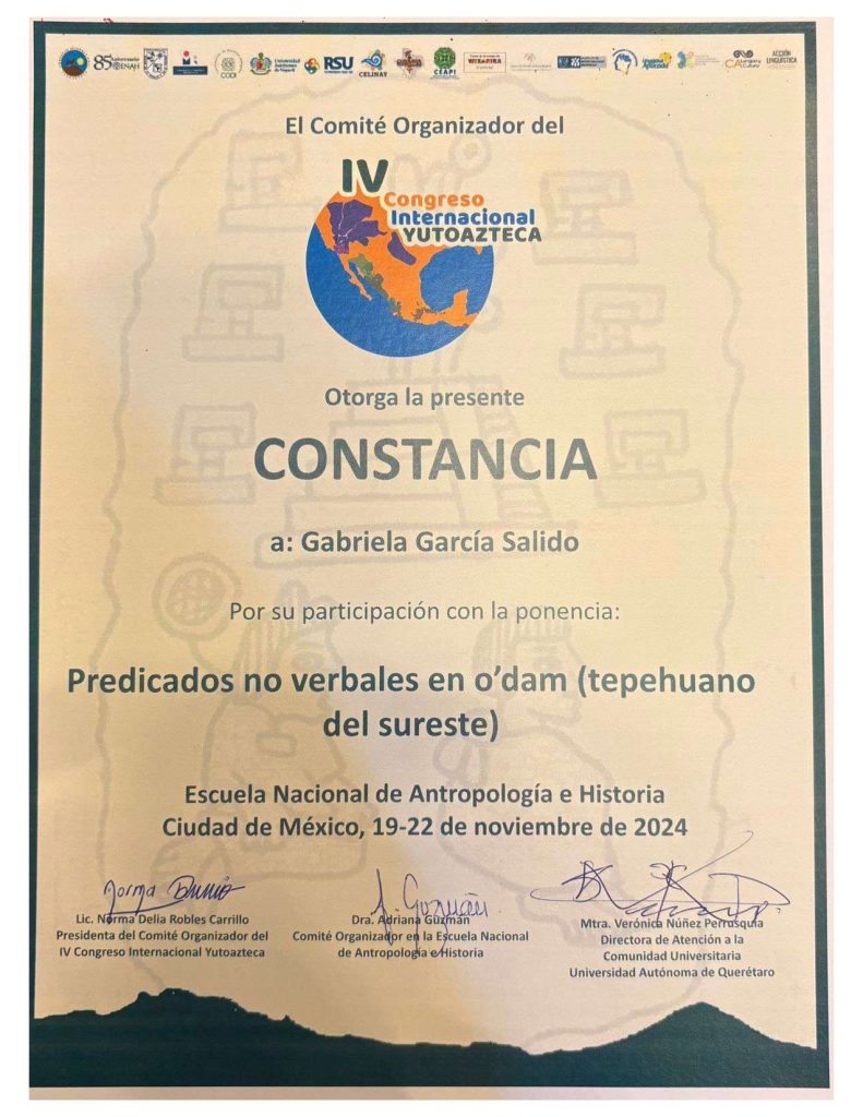 2024. Predicados no verbales en o’dam. Congreso Internacional Yutoaztecas. ENAH, México. 19 al 22 de noviembre de 2024.