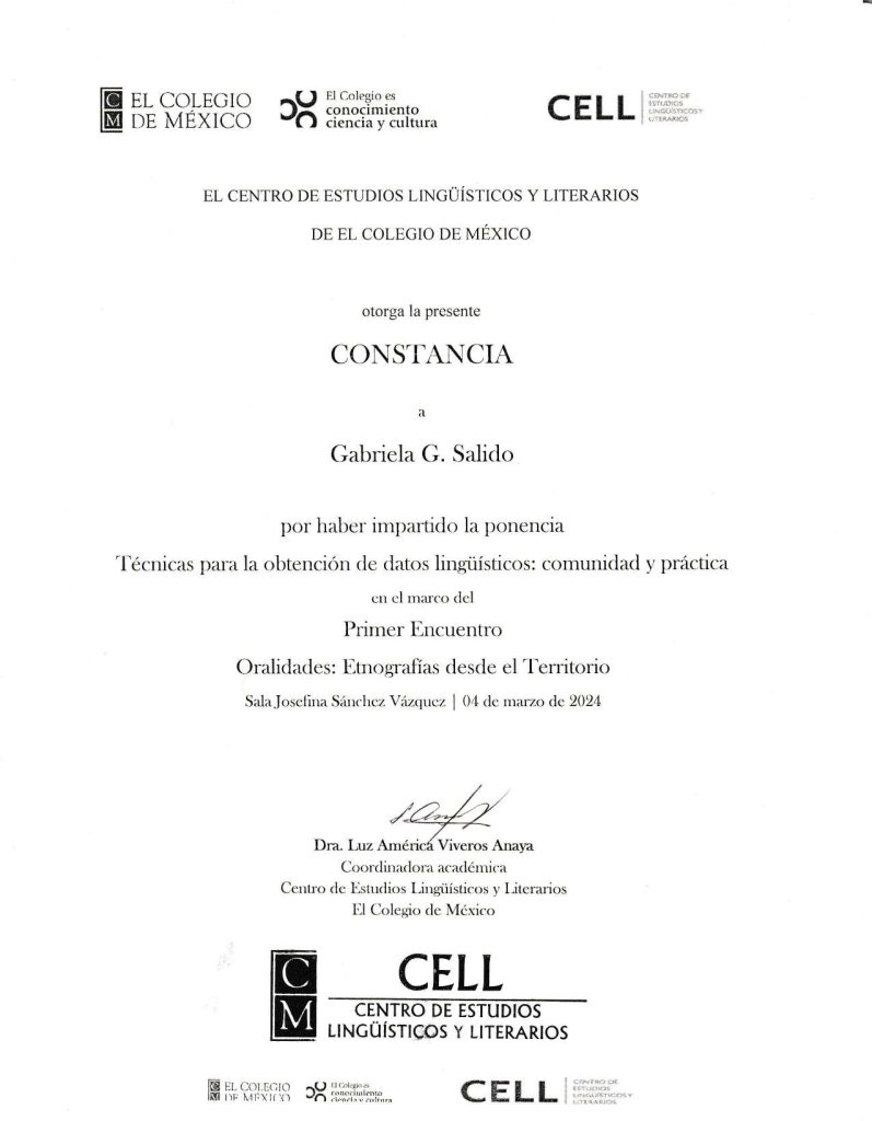 2024. Técnicas para la obtención de datos lingüísticos: comunidad y práctica. COLMEX. 4 de marzo de 2024. (por invitación).