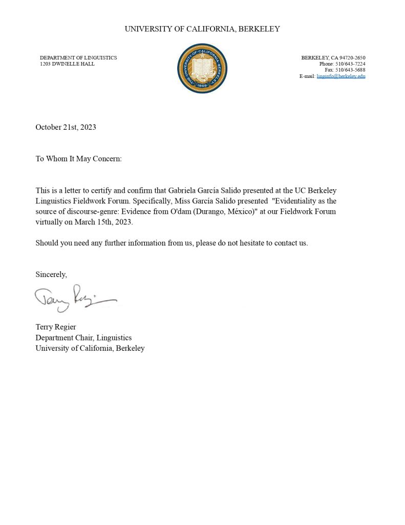 2023. Evidentiality as the source of discourse-genre: Evidence from O’dam (Durango, México). Fieldwork Forum (FForum. https://lx.berkeley.edu/fforum. March 15th, (co-autor Michael Everdell, UT-Austin. (por invitación).