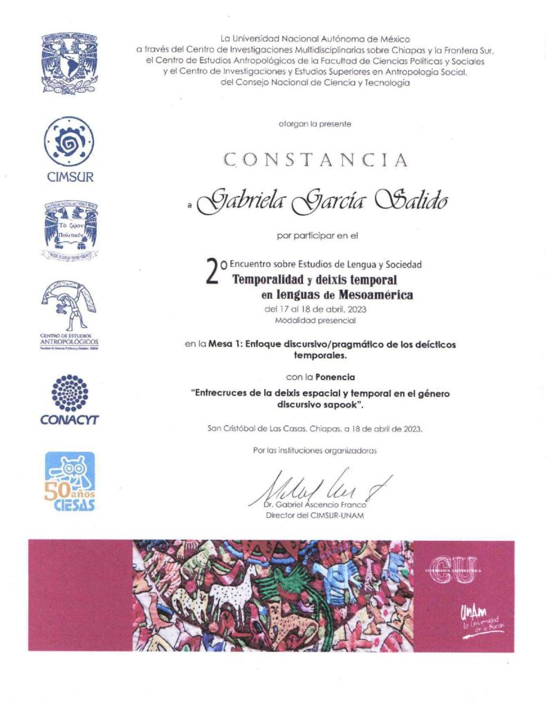 2023. Entrecruces de la deixis espacial y temporal en el género discursivo sapook. Segundo Encuentro sobre Estudios de Lengua y Sociedad “Temporalidad y deixis temporal en lenguas de Mesoamérica» del Seminario Permanente sobre Lengua y Sociedad, 17 y 18 de abril en CIMSUR (por invitación).