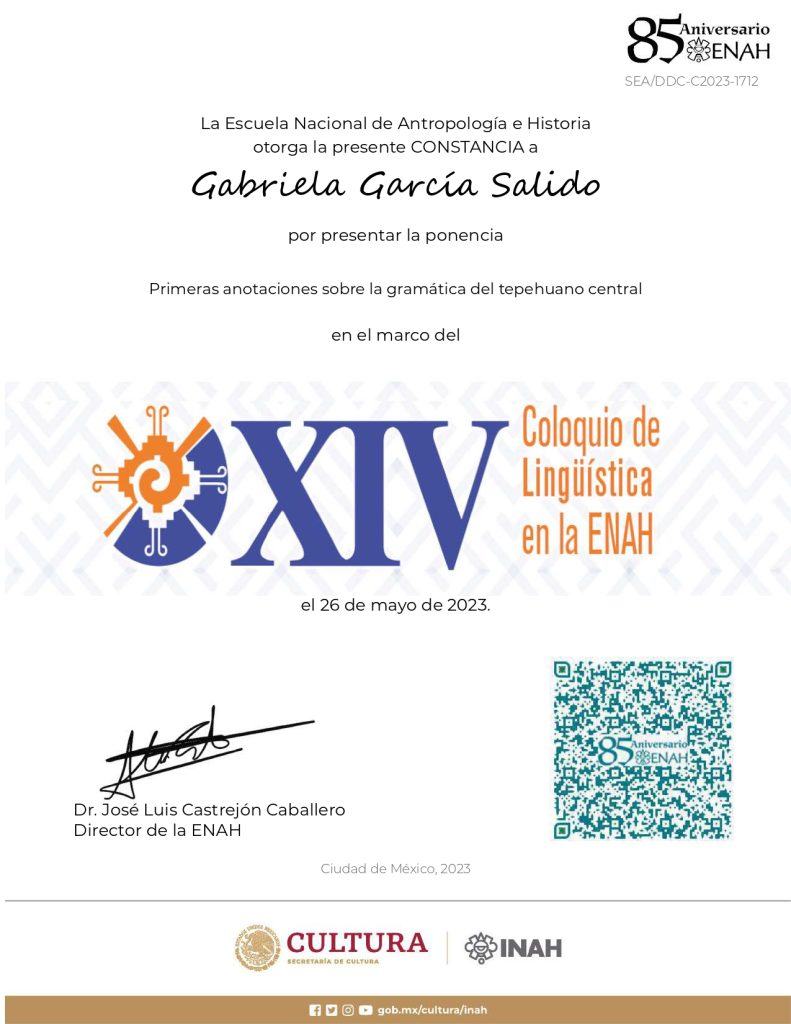 2023. Primeras anotaciones sobre la gramática del tepehuano central. XIV Coloquio de Lingüística en la ENAH, 24, 25 Y 26 de mayo de 2023, (co-autores Manuel Andrés Pérez Pérez y Miranda Amairany Flores Cházaro).
