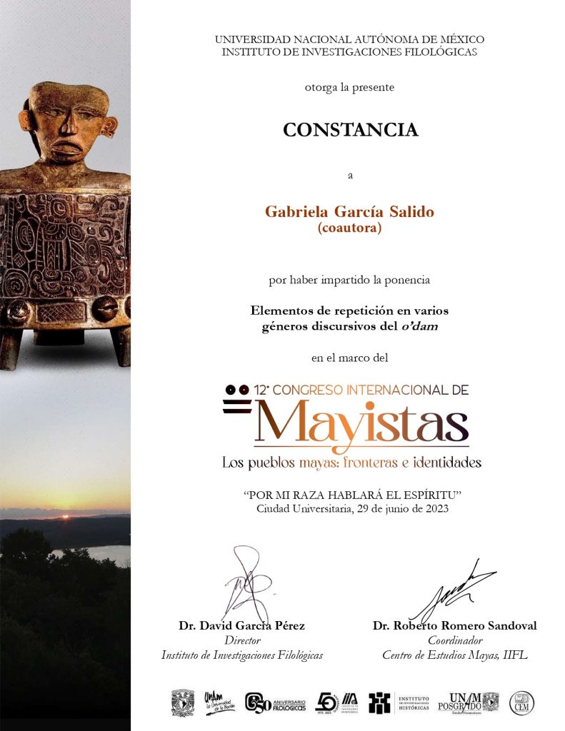 2023. Elementos de repetición en varios géneros discursivos del o’dam. Simposio La repetición en el área maya y Mesoamérica: semiótica, poética, pragmática. XII Congreso Internacional de Mayistas que se celebrará en la Ciudad de México, del 25 de junio al 1 de julio de 2023, (co-autor Antonio Reyes, INAH-Durango). (por invitación).