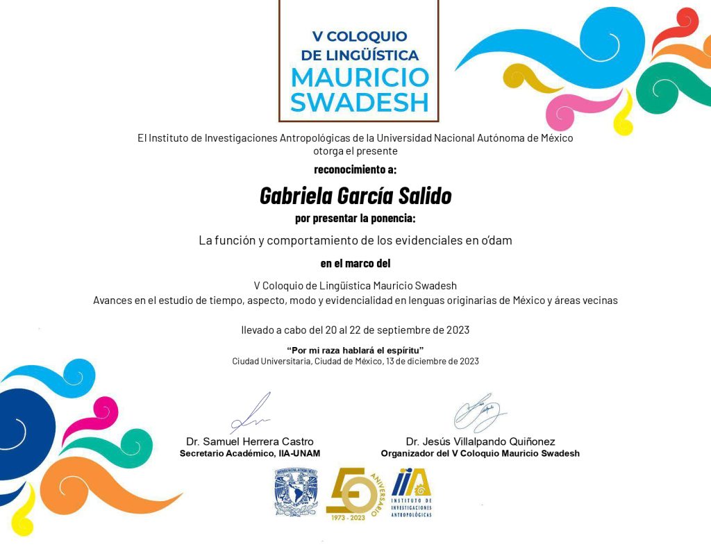 2023. La función y comportamiento de los evidenciales en o’dam. Coloquio Mauricio Swadesh (Lingüística): “Avances en el estudio de Tiempo, Aspecto, Modo y Evidencialidad en lenguas originarias de México y áreas vecinas”, 20, 21 y 22 de septiembre de 2023, (co-autor Michael Everdell, UT-Austin).