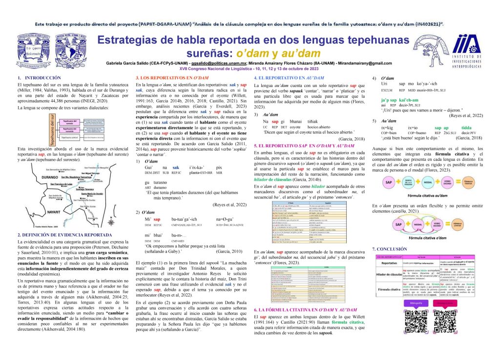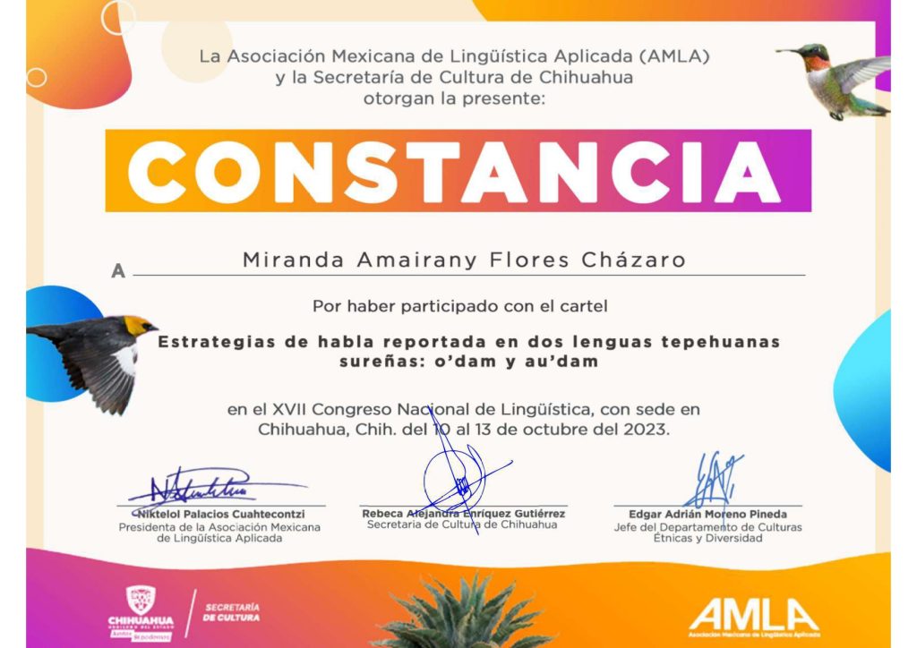 2023. Estrategias de habla reportada en dos lenguas tepehuanas sureñas: o’dam y au’dam. XVII Congreso Nacional de Lingüística en el Departamento de Culturas Étnicas y Diversidad de la Secretaría de Cultura del Estado de Chihuahua, del 10 al 13 de octubre del 2023, (co-autora Miranda Amairany Flores Cházaro, Posgrado UNAM).