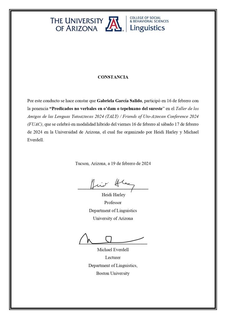 2024. Predicados no verbales en o’dam o tepehuano del sureste. Friends of Uto-Aztecan Conference (FUAC), en Tucson, Arizona del 16 al 17 de febrero de 2024.