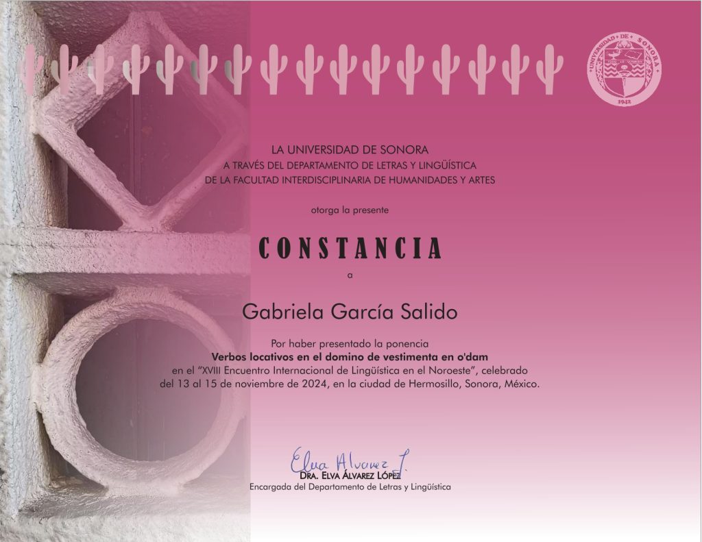 2024. Verbos locativos en el dominio de la vestimenta en o’dam. Departamento de Lingüística en la Universidad de Sonora. Congreso Internacional del Noroeste de México (ELNOR 2024). 12 al 15 de noviembre de 2024.