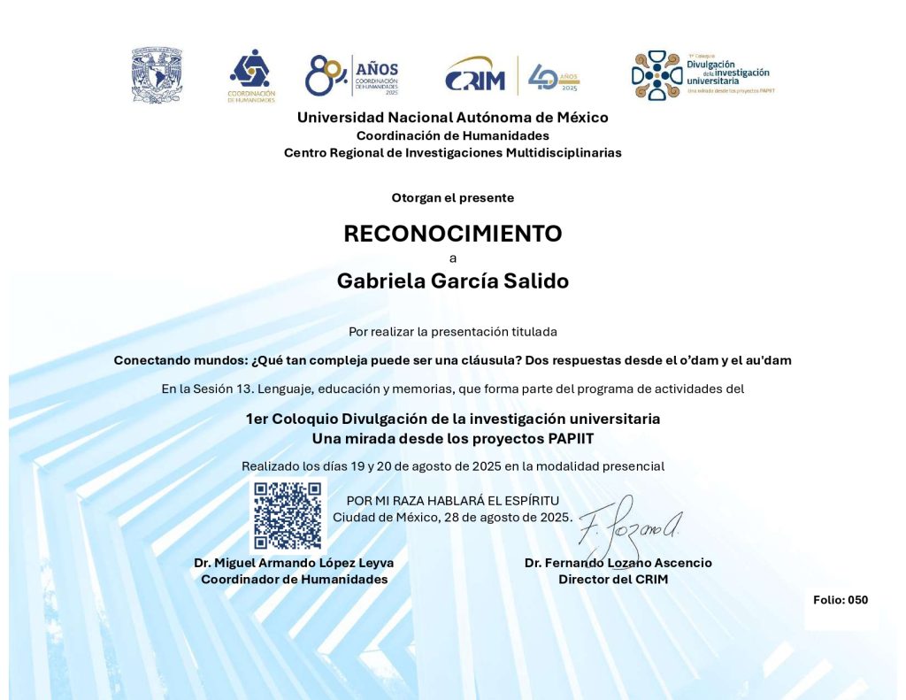 2025. Conectando mundos: ¿Qué tan compleja puede ser una cláusula? Dos respuestas desde el o’dam y el au’dam. Primer Coloquio “Divulgación de la investigación universitaria: una mirada desde los proyectos PAPIIT”. UNAM.19 y 20 de agosto de 2025.