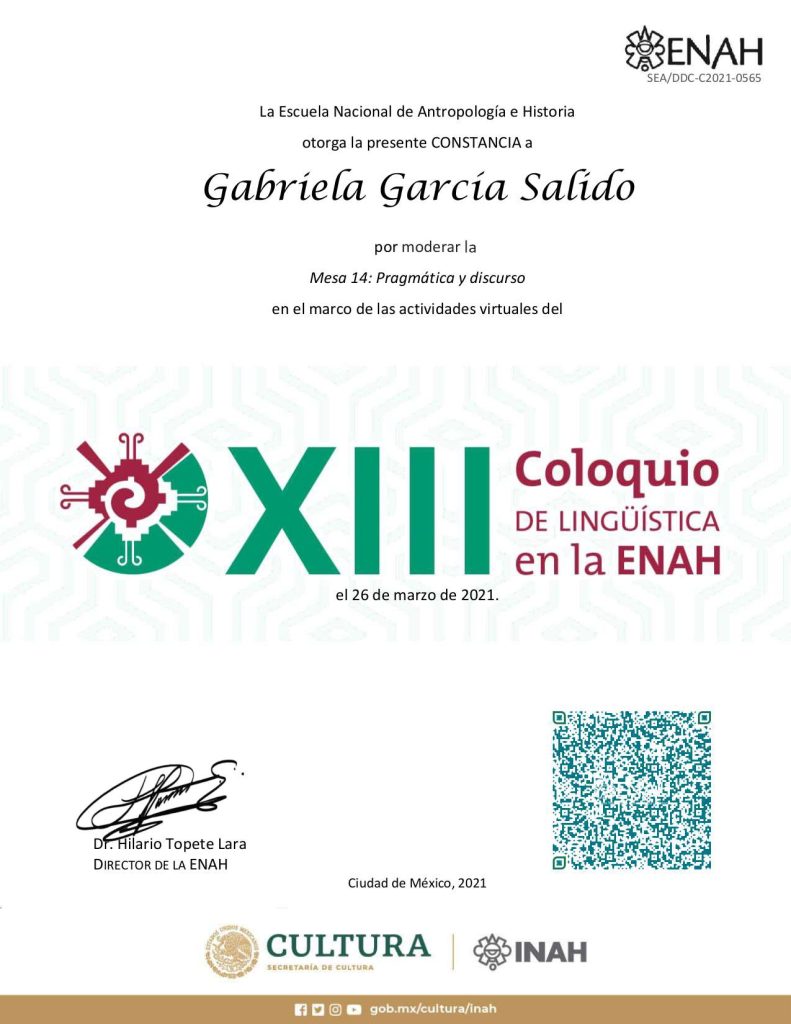 2021, moderadora, Mesa 14: “Pragmática y discurso”, modalidad virtual, XIII Coloquio de Lingüística en la ENAH, Escuela Nacional de Antropología e Historia, 26 de marzo de 2021, Ciudad de México.