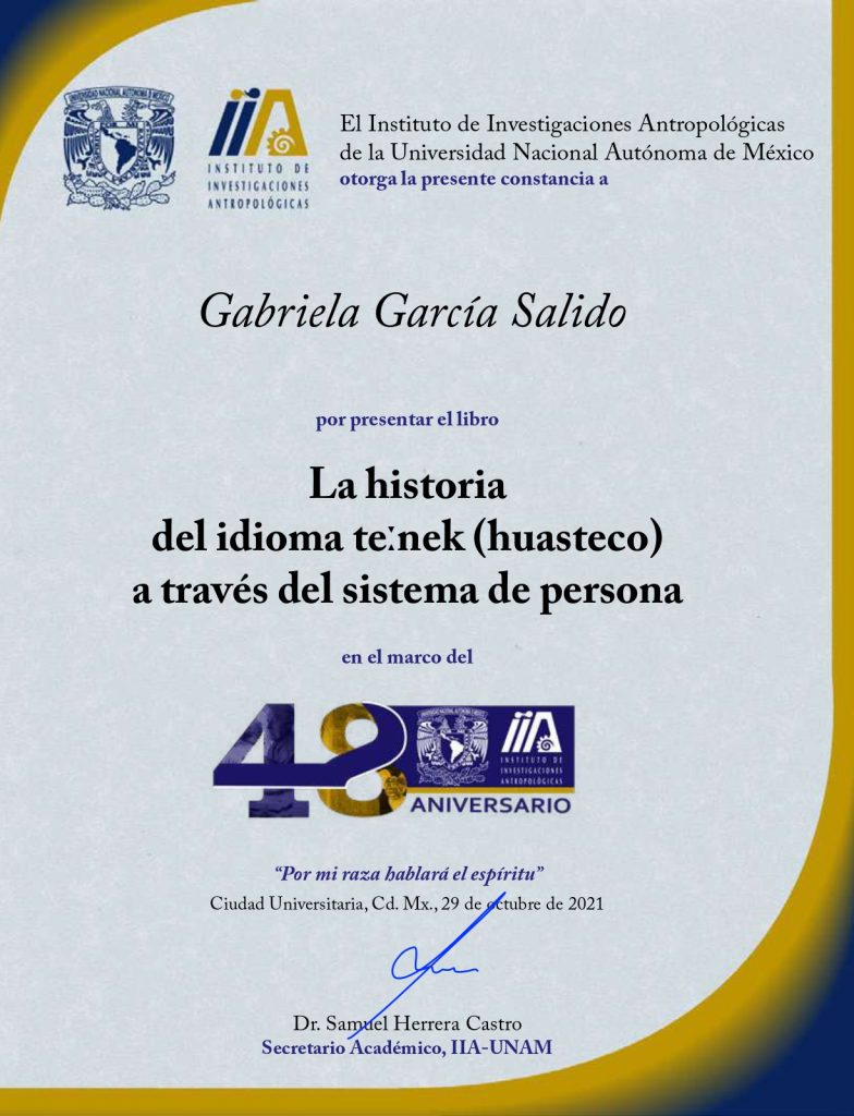 2021, ponente, presentación del libro “La historia del idioma tének (huasteco) a través del sistema de persona”, modalidad presencial, Instituto de Investigaciones Antropológicas-UNAM (42 aniversario), 29 de octubre de 2021, Ciudad Universitaria, CDMX.