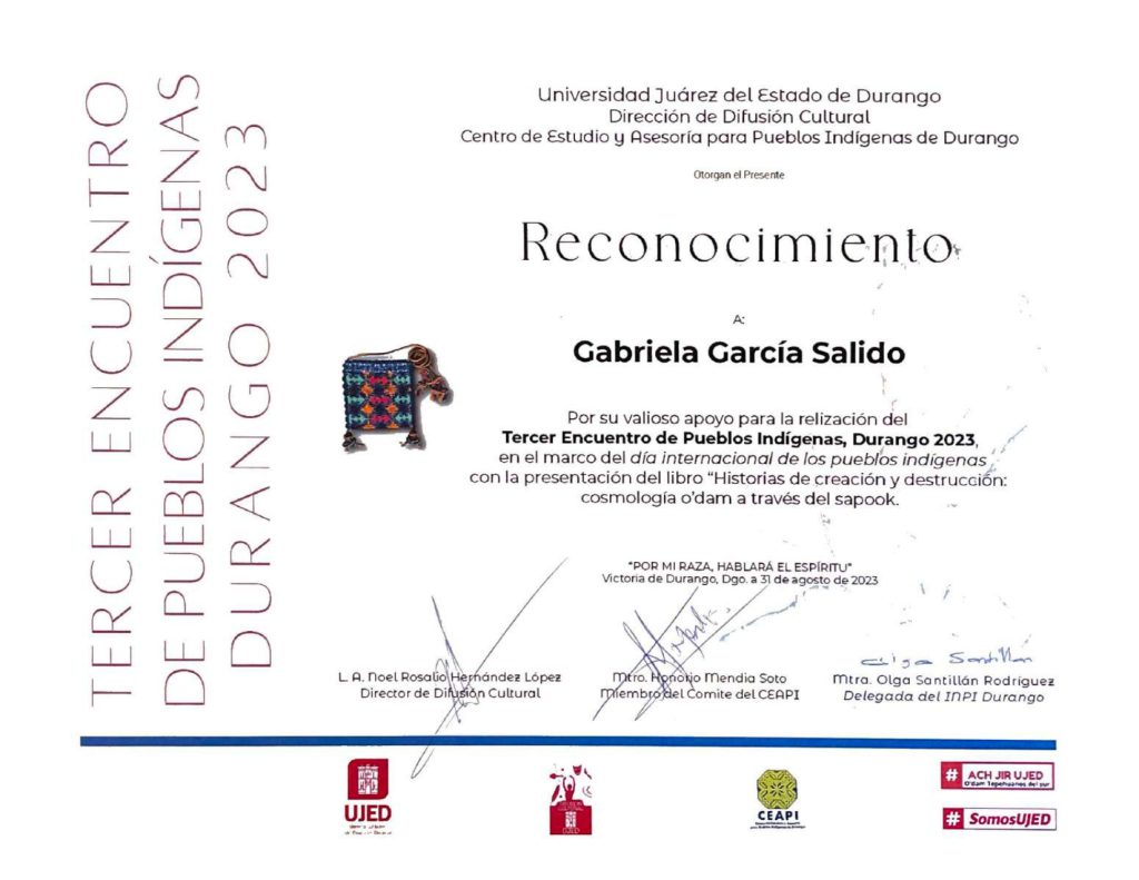 2023, participante, “Tercer Encuentro de Pueblos Indígenas, Durango 2023”, modalidad presencial, Universidad Juárez del Estado de Durango, 31 de agosto de 2023, Victoria de Durango, Durango.