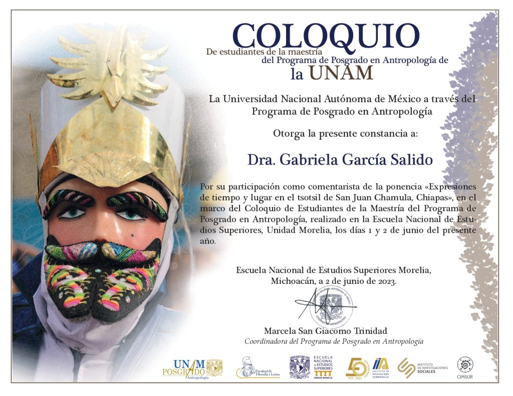 2023, comentarista, “Coloquio de Estudiantes de la Maestría del Programa de Posgrado en Antropología”, modalidad presencial, UNAM (ENES Morelia), 1 y 2 de junio de 2023, Morelia, Michoacán.