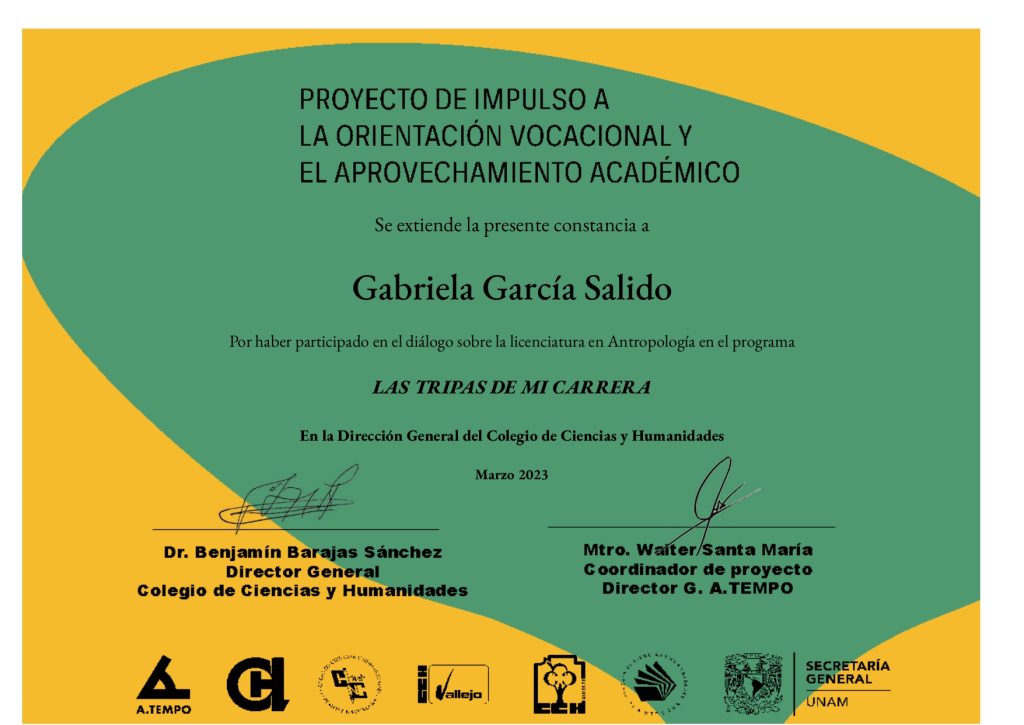 2023, participante, “Las tripas de mi carrera” (diálogo sobre la licenciatura en Antropología), modalidad no especificada, Dirección General del Colegio de Ciencias y Humanidades, UNAM, marzo de 2023.