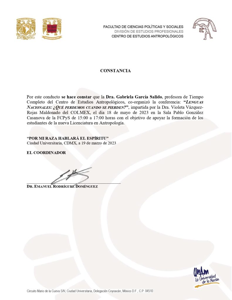 2023, coorganizadora, conferencia “Lenguas nacionales: ¿Qué perdemos cuando se pierden?”, impartida por la Dra. Violeta Vázquez-Rojas Maldonado (COLMEX), modalidad presencial, Centro de Estudios Antropológicos, FCPyS-UNAM, 18 de mayo de 2023, Ciudad de México.