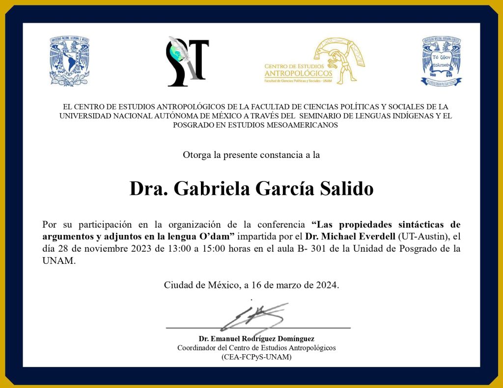 2023, organizadora, conferencia “Las propiedades sintácticas de argumentos y adjuntos en la lengua O’dam”, impartida por el Dr. Michael Everdell (UT-Austin), modalidad presencial, Seminario de Lenguas Indígenas y Posgrado en Estudios Mesoamericanos, UNAM, 28 de noviembre de 2023, Ciudad de México.