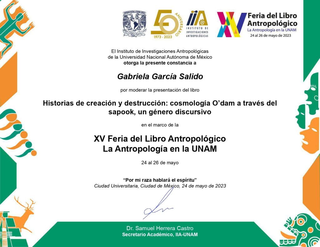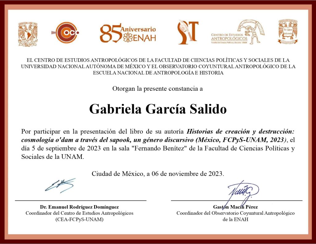 2023, participante, presentación del libro “Historias de creación y destrucción: cosmología o’dam a través del sapook, un género discursivo”, modalidad presencial, Facultad de Ciencias Políticas y Sociales-UNAM / ENAH, 5 de septiembre de 2023, Ciudad de México.
