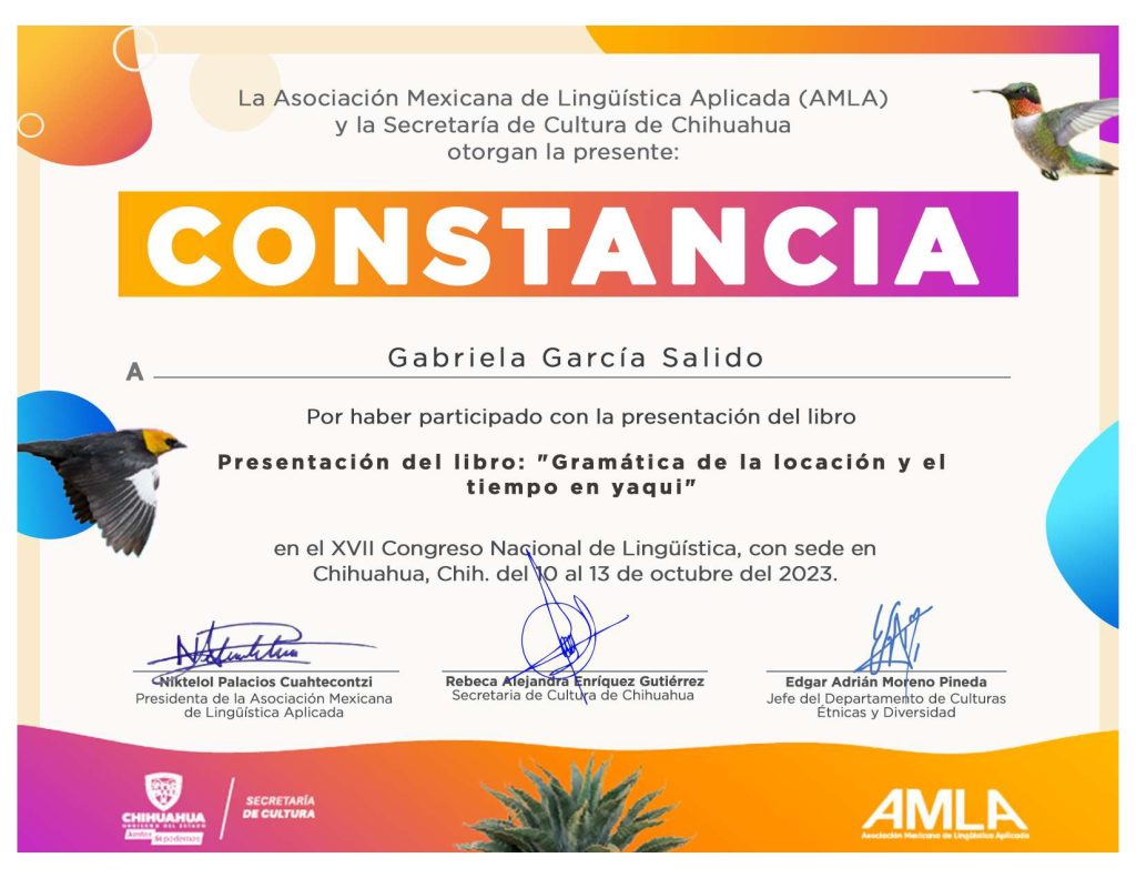2023, participante, presentación del libro “Gramática de la locación y el tiempo en yaqui”, modalidad presencial, XVII Congreso Nacional de Lingüística (AMLA y Secretaría de Cultura de Chihuahua), del 10 al 13 de octubre de 2023, Chihuahua, Chihuahua.