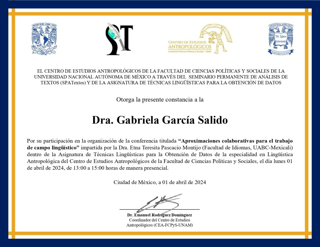 2024, organizadora, conferencia “Aproximaciones colaborativas para el trabajo de campo lingüístico”, impartida por la Dra. Etna Teresita Pascacio Montijo (UABC-Mexicali), modalidad presencial, Centro de Estudios Antropológicos, FCPyS-UNAM, 1 de abril de 2024, Ciudad de México.