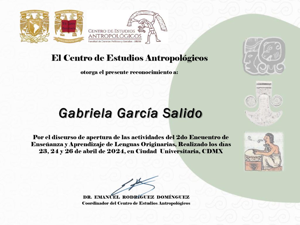 2024, participante (discurso de apertura), “2º Encuentro de Enseñanza y Aprendizaje de Lenguas Originarias”, modalidad presencial, Centro de Estudios Antropológicos, FCPyS-UNAM, 23, 24 y 26 de abril de 2024, Ciudad Universitaria, CDMX.