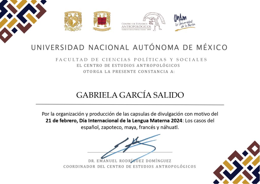 2024, organizadora, “Cápsulas de divulgación con motivo del 21 de febrero, Día Internacional de la Lengua Materna 2024: los casos del español, zapoteco, maya, francés y náhuatl”, modalidad no especificada, Centro de Estudios Antropológicos, FCPyS-UNAM, 2024.