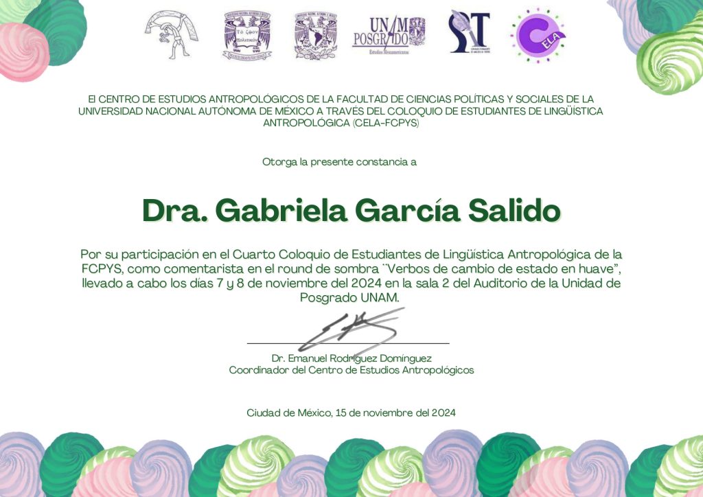 2024, comentarista, “Cuarto Coloquio de Estudiantes de Lingüística Antropológica (CELA-FCPyS)”, modalidad presencial, Centro de Estudios Antropológicos, FCPyS-UNAM, 7 y 8 de noviembre de 2024, Ciudad de México.