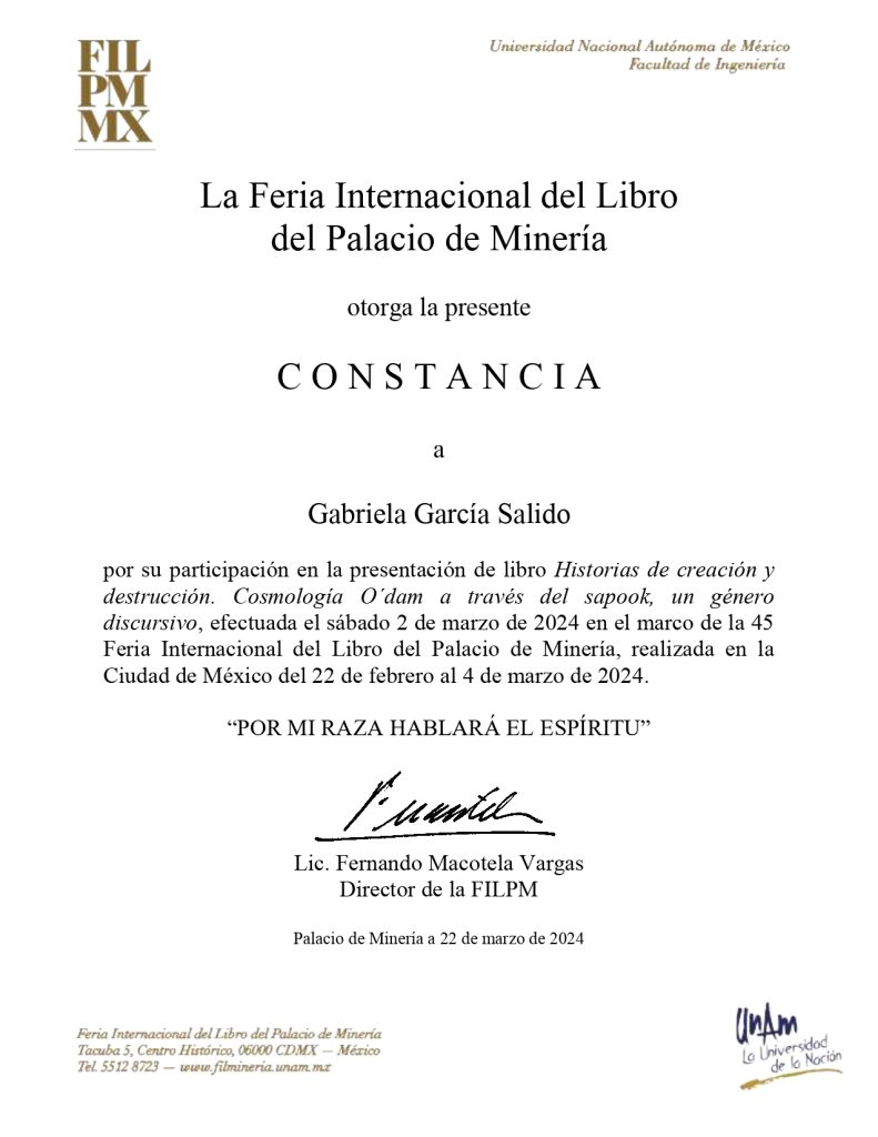 2024, participante, presentación del libro “Historias de creación y destrucción. Cosmología O’dam a través del sapook, un género discursivo”, modalidad presencial, Feria Internacional del Libro del Palacio de Minería (UNAM), 2 de marzo de 2024, Ciudad de México.