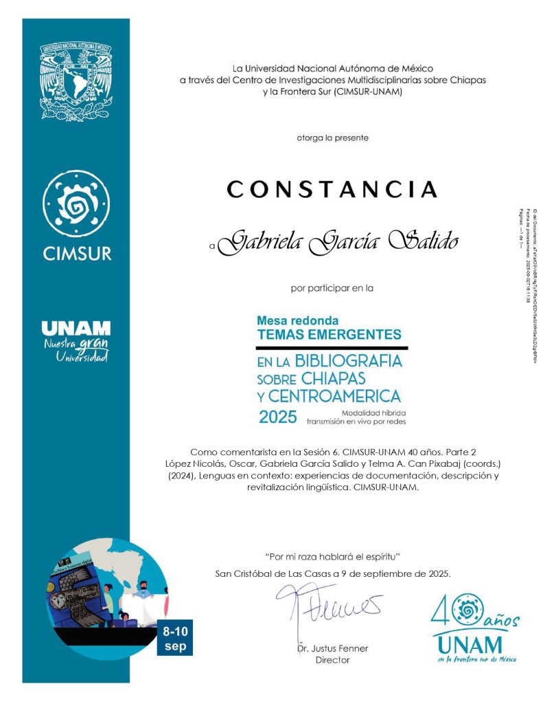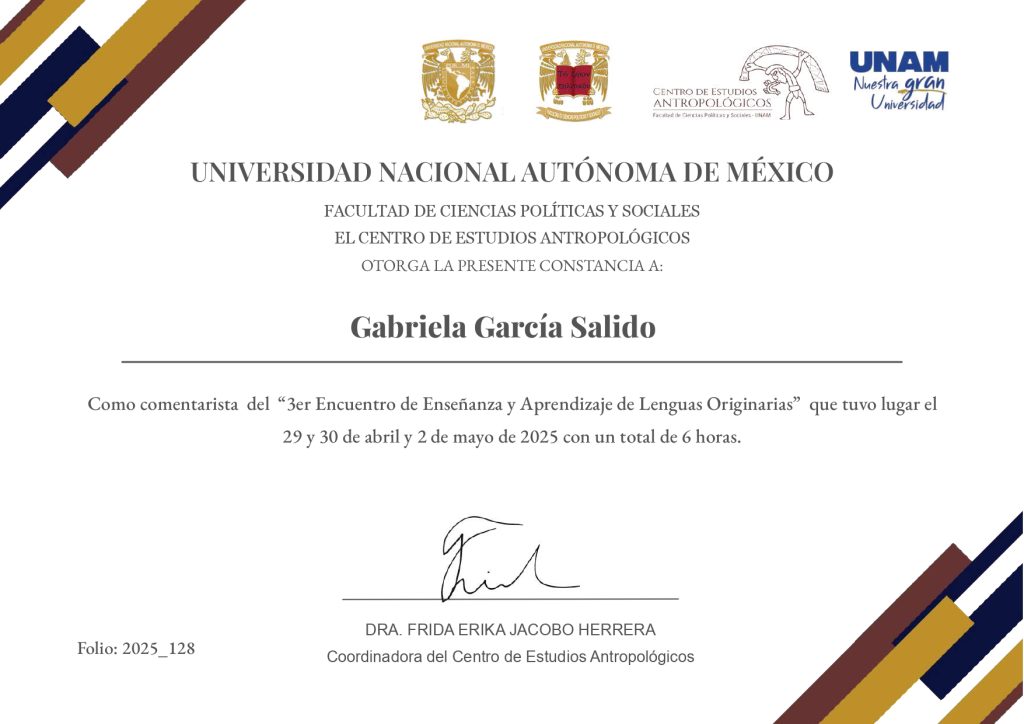 2025, comentarista, “3er Encuentro de Enseñanza y Aprendizaje de Lenguas Originarias”, modalidad presencial, Centro de Estudios Antropológicos, FCPyS-UNAM, 29 y 30 de abril y 2 de mayo de 2025, con una duración de 6 horas.