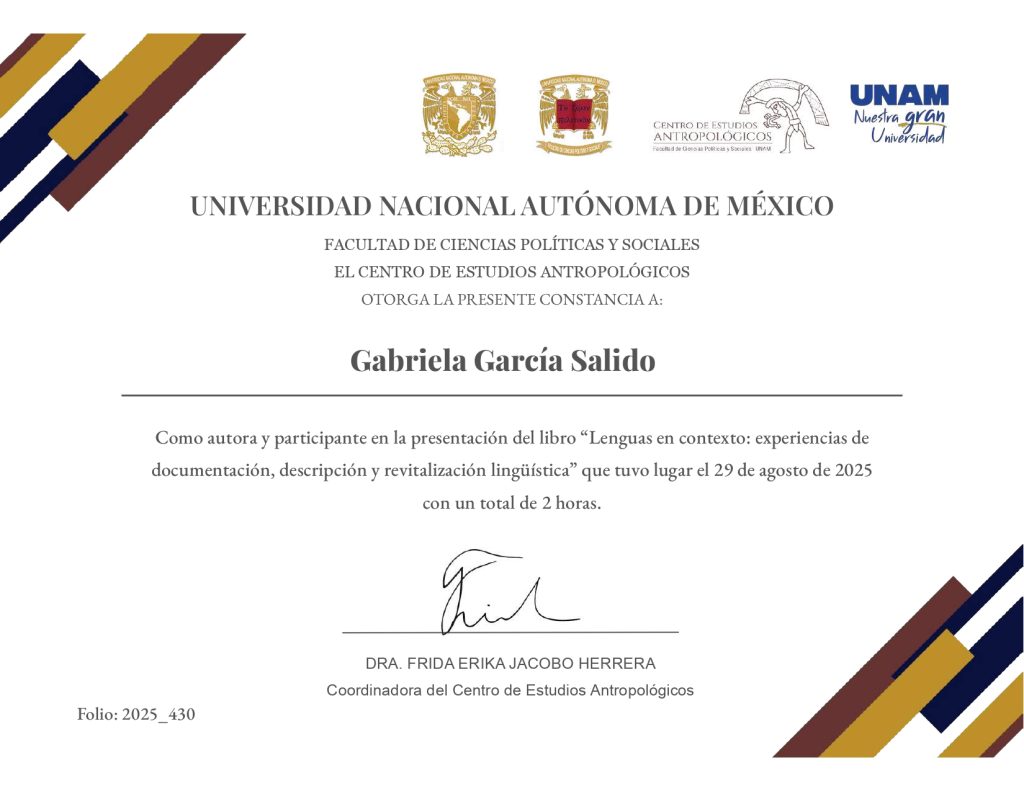 2025, autora y participante, presentación del libro “Lenguas en contexto: experiencias de documentación, descripción y revitalización lingüística”, modalidad presencial, Centro de Estudios Antropológicos, FCPyS-UNAM, 29 de agosto de 2025, con una duración de 2 horas.