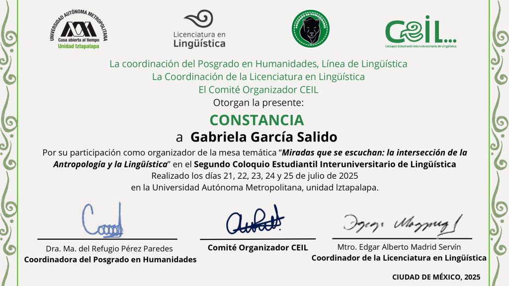 2025, organizadora, mesa temática “Miradas que se escuchan: la intersección de la Antropología y la Lingüística”, modalidad presencial, Segundo Coloquio Estudiantil Interuniversitario de Lingüística, Universidad Autónoma Metropolitana, unidad Iztapalapa, del 21 al 25 de julio de 2025, Ciudad de México.