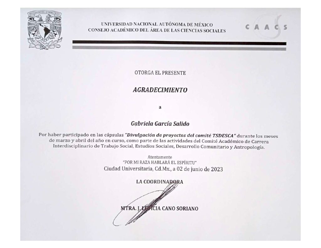 2023, participante, “Divulgación de proyectos del comité TSDESCA”, modalidad no especificada, Comité Académico de Carrera Interdisciplinario de Trabajo Social, Estudios Sociales, Desarrollo Comunitario y Antropología (CAACS, UNAM), durante los meses de marzo y abril de 2023, Ciudad Universitaria.